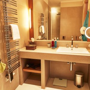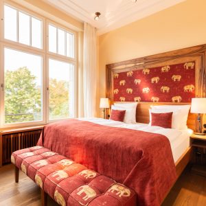 All guestrooms at Orania.Berlin boast comforts such as premium bedding and heated floors, as well as thoughtful touches like pillow menus and laptop-compatible safes.